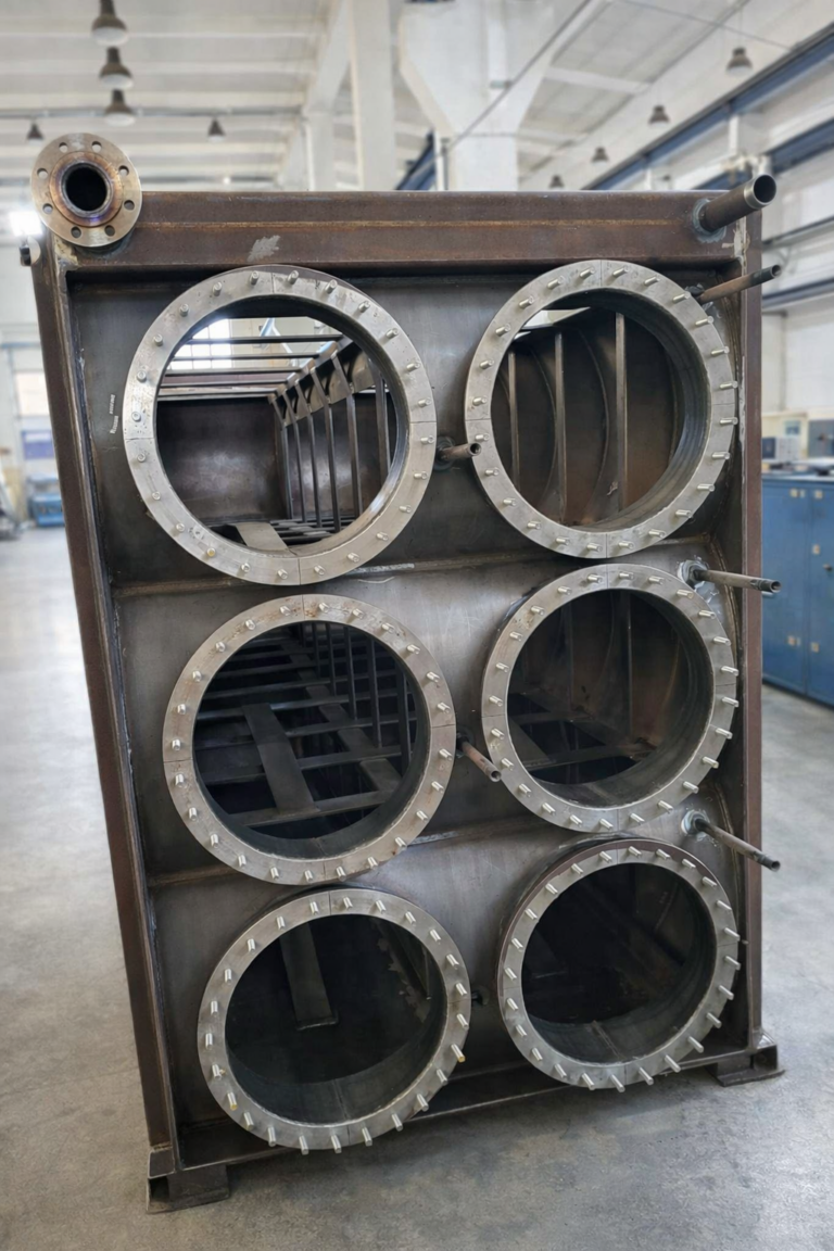 This tube heat exchanger is a custom-fabricated, heavy-duty unit designed for demanding industrial applications. The robust steel construction and multi-pass configuration ensure efficient heat transfer while maintaining high mechanical strength for long-term operation.